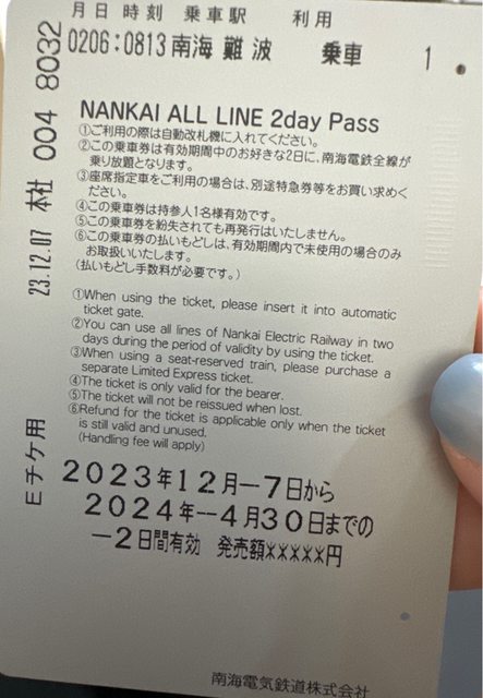 南海電鐵 2日券(剩一日),期限至2024/4/30