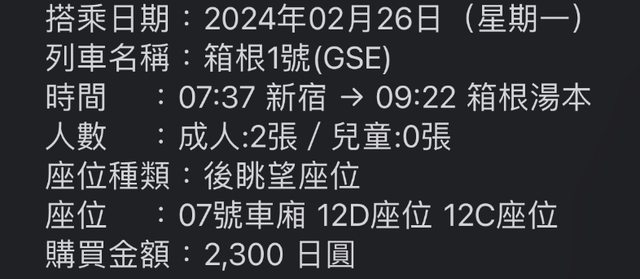 標題[讓售] 新宿至箱根小田急浪漫特快後眺望位