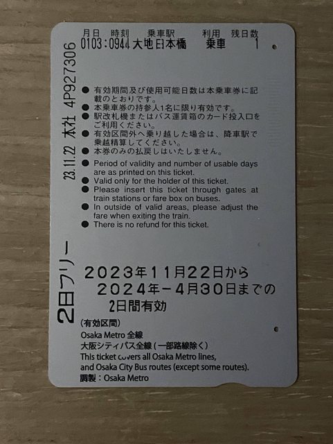 標題[讓售] 大阪地鐵巴士二日乘車券 剩一日