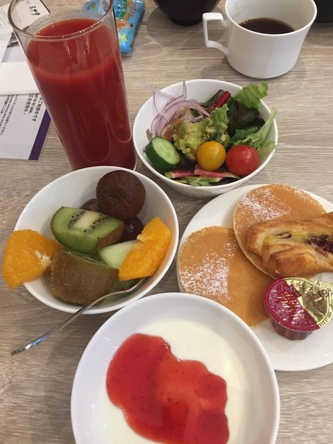 像是今天的水果有荔枝,麵包的話昨天是格子狀的鬆餅,今天則是圓餅型的。