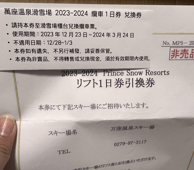 標題[贈送] 東京萬座溫泉滑雪場一日纜車券*2
