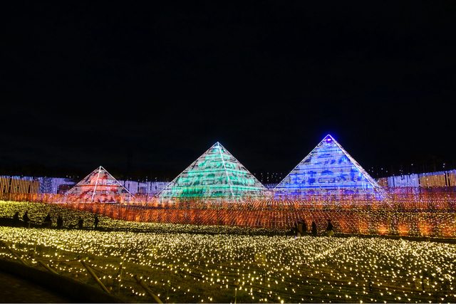 傍晚出發名花之里看燈飾展,主題是黃金金字塔,先上二樓看了幾遍全景,才下樓走進主