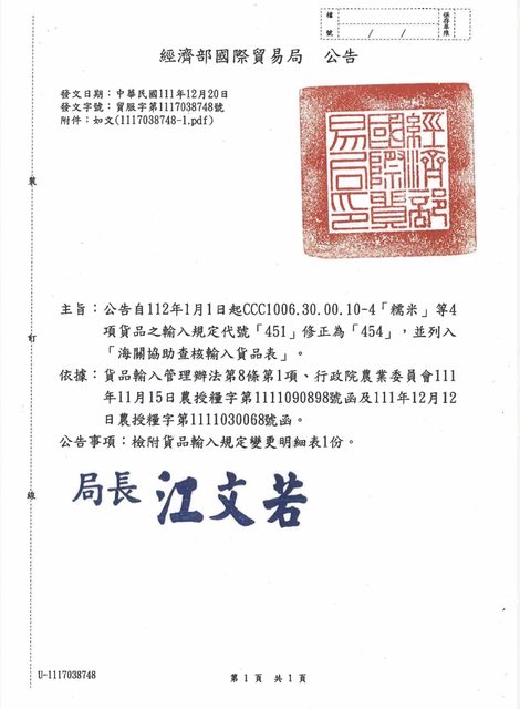 : 標題: Re: [資訊] 1120101起帶米6公斤以下免通關簽署