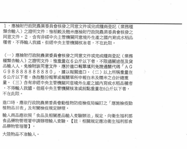 : 1~6kg的食用白米,只需要國貿局許可