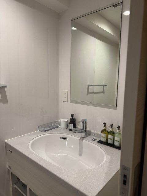 浴室洗手台有DHC備品(卸妝油、洗面乳、化妝水、乳液)