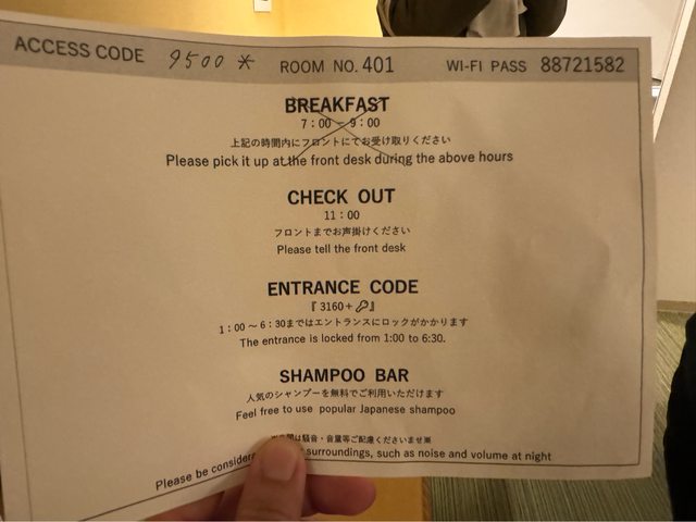入住時會拿到一張入住資訊,房門是使用密碼鎖(先加分),飯店大門01:00~06:30進出