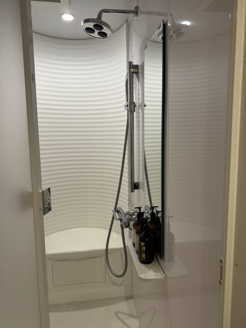 洗澡間是半圓形設計,坐著洗澡好爽快
