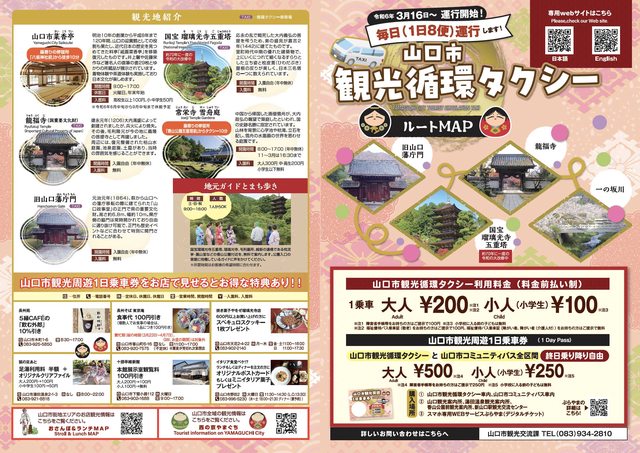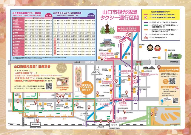 僅1枚「500元」硬幣,可購入1日內無限次搭乘的「山口市觀光周遊1日乘車券」配合「山口市觀光循環計程車」行駛期間一併販賣。持此乘車卷可搭乘「山口市觀光循環計程車」及「山口市社區巴士」行駛之全區間。