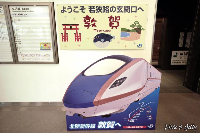 新幹線預計2024年春開業的看板,上方的敦賀站牌,代表著氣比神宮鳥居、河豚、氣比松