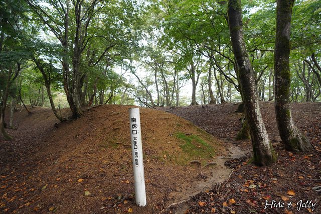 再走4分鐘,就可以看到玄蕃尾城的案內板出現在前方的樹林中了,從停車場出發,大約