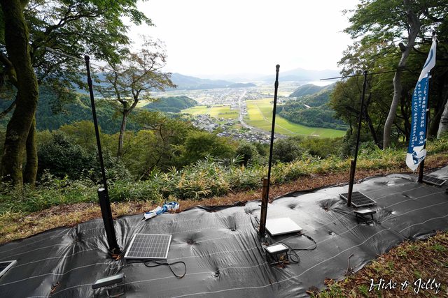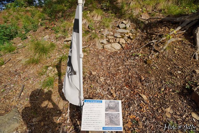 本丸往西側也有一塊立著旗子,鋪著塑膠布,地上有太陽能地燈的裝置,前方也刻意把樹