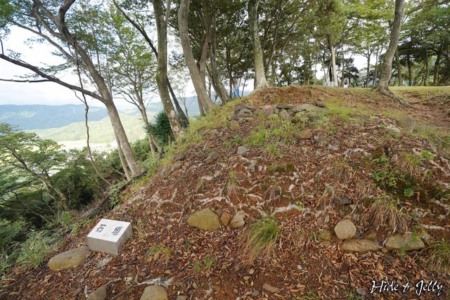 巨大的礎石。本丸南側有土壇,上方也有礎石,若存在著建築物的話,應該就可以推定為