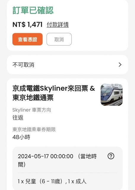 1. 讓售品項:Klook Skyliner京成電鐵車票 +48小時東京地鐵票(1大1小) 2. 物品圖片: