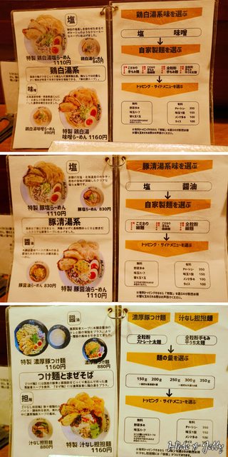 店內提供三種類的麵,雞白湯、豚清湯、沾麵,雞白湯可以選擇鹽味、味噌,豚清湯可以