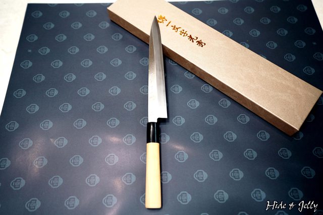 於是我們得到了一把,乍看樸實,其實很美型的柳刃(生魚片刀),上面刻著「堺一文字」