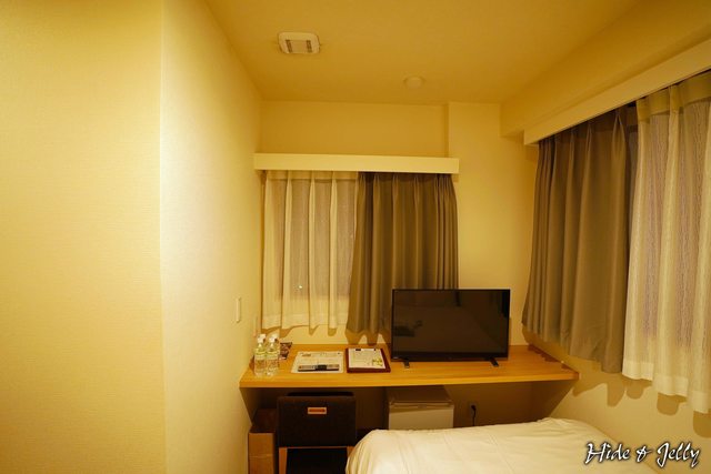 一張中等Size的雙人床幾乎塞好塞滿,床前的書桌上放置著26吋的電視,下方有小冰箱,