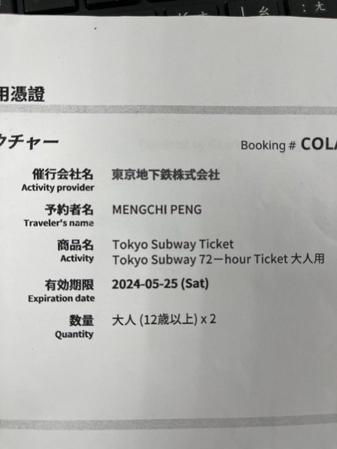 標題[讓售] 東京地下鐵72小時券 (1套2張500元)