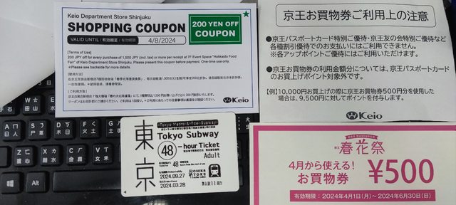 東京地鐵48小時券,加上贈送 京王百貨折價券(500+200)