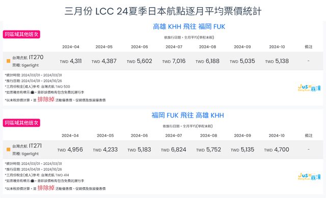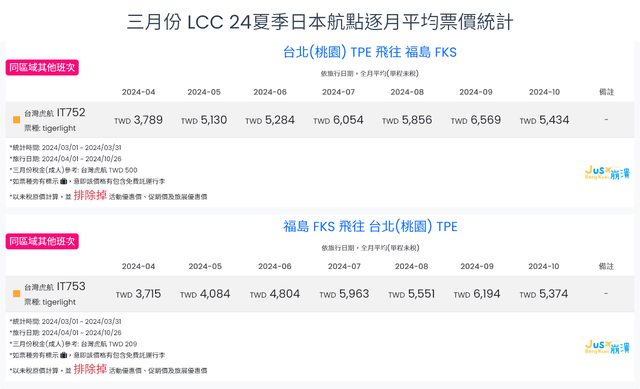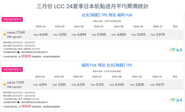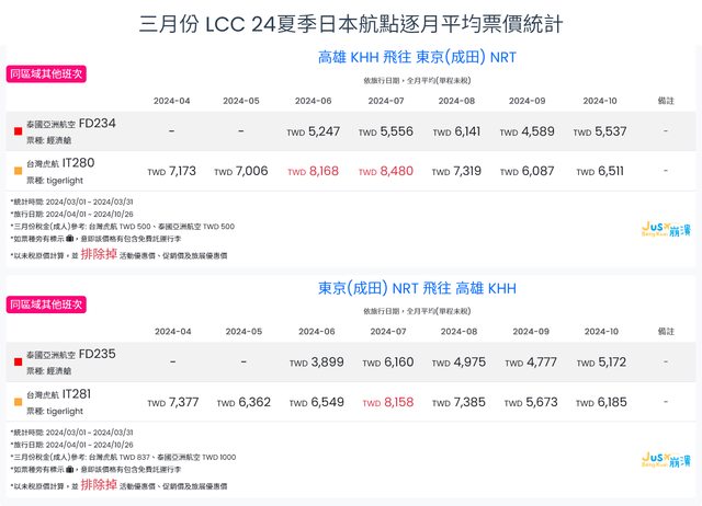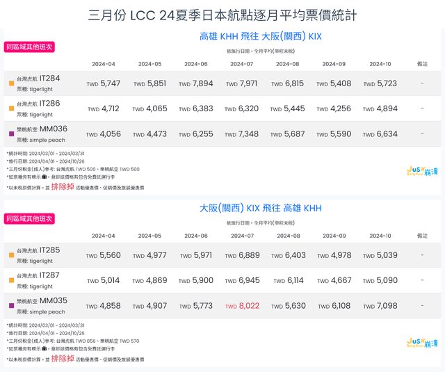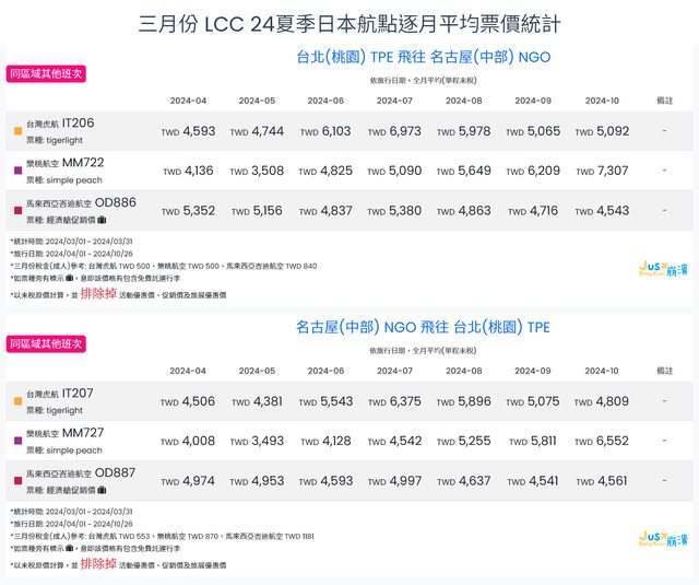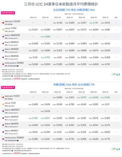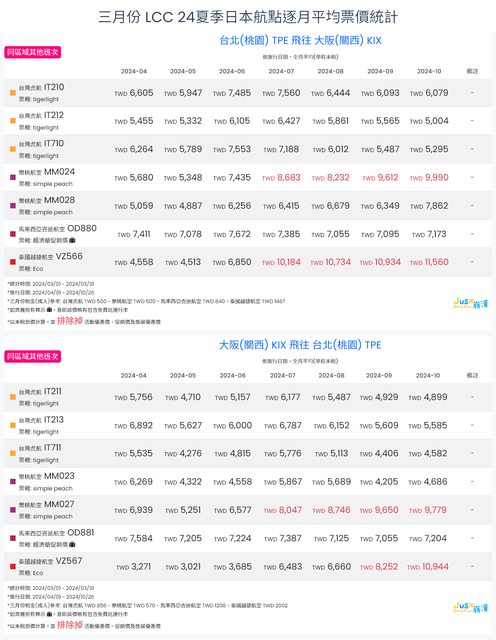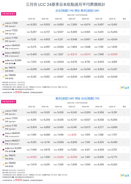 標題[分享] 3月LCC 24夏日本航點逐月均價統計