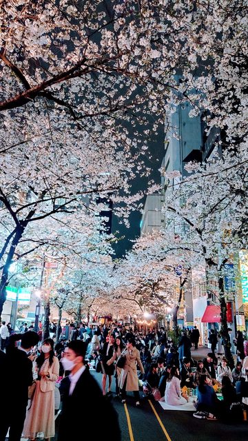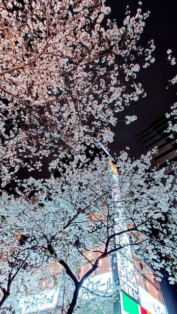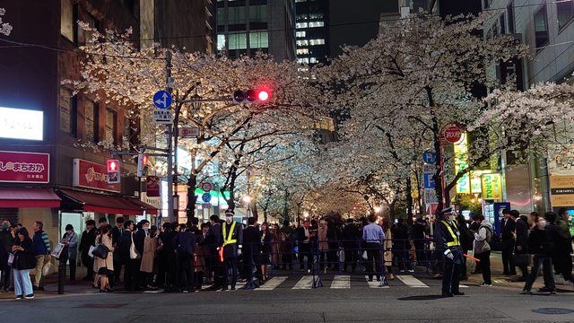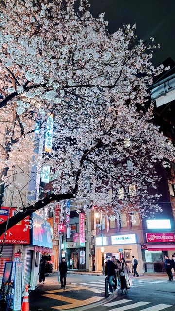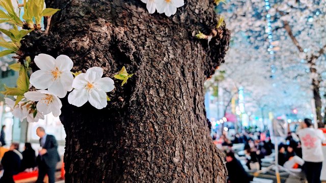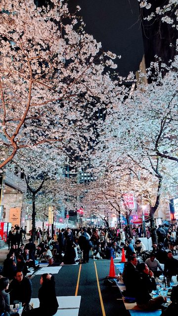 ori 街的地方看到滿開的櫻花,上班族下班都來這點席地而坐野餐賞夜櫻,好浪漫愜意!