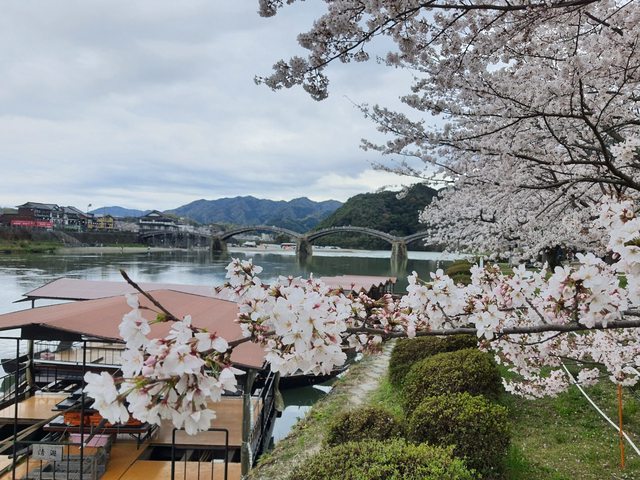 去的時候剛好有點陰天但不減錦帶橋配上櫻花之美