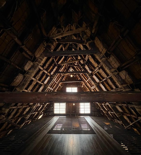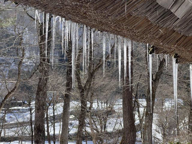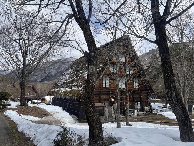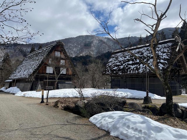 合掌村屋頂上的雪化掉不少,