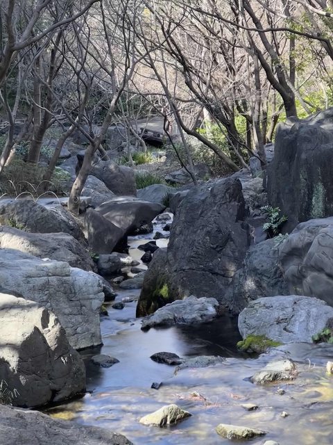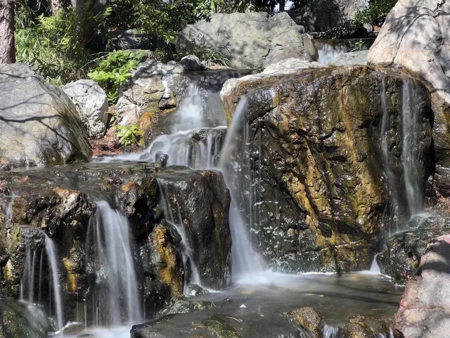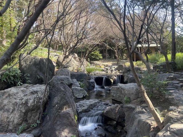 有小山、庭園、小瀑布、水塘,