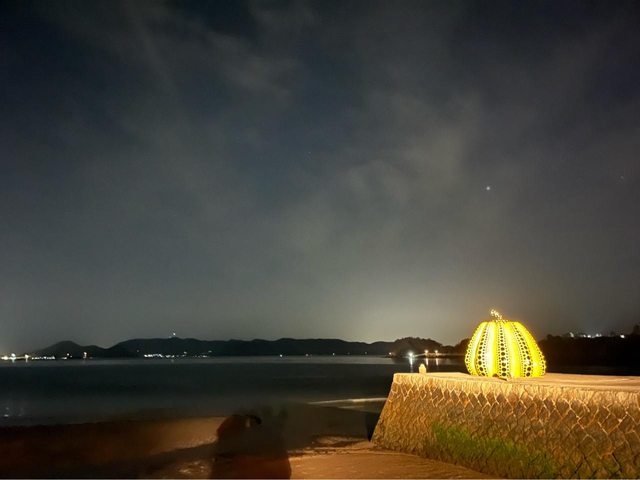 晚上搭接駁車到宮浦港附近買晚餐,順便看一下夜晚的紅南瓜(外部打燈、內部也有點燈 )。