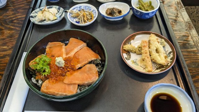 裡面套餐大約都1000円上下 跟我家那位分別點了海鮮丼與鮭魚親子丼