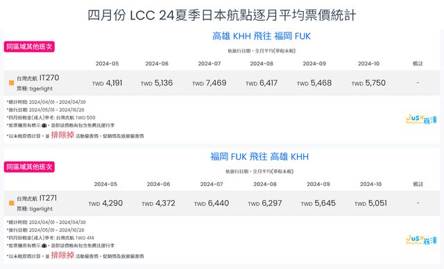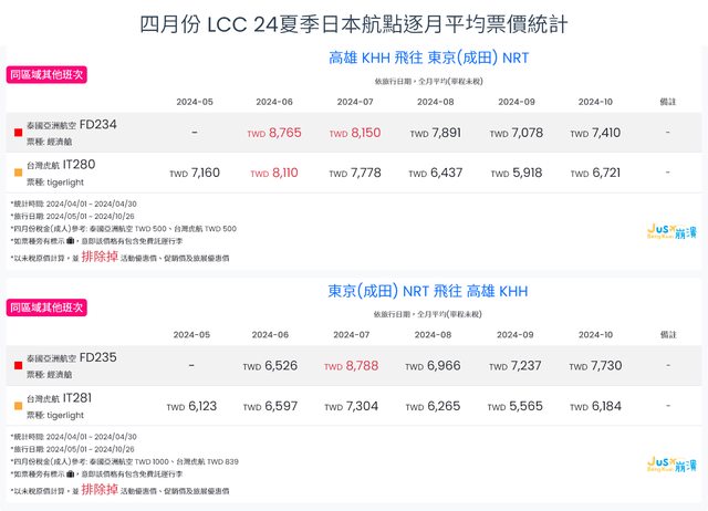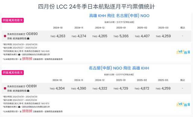 標題[分享] 4月LCC 24夏、24冬日本航點逐月均價統計