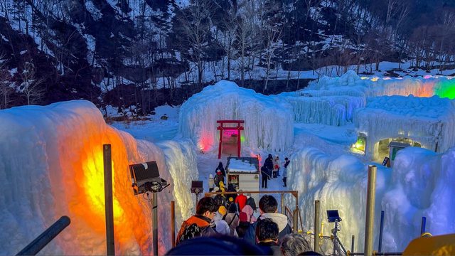 冰瀑祭的會場設於流經層雲峽溫泉的石狩川河岸,開放時間為下午5點到晚上9點半,入夜