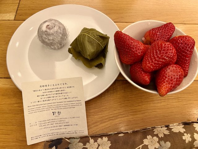 晚餐一樣是回旅館大廳,吃今天買的草莓大福、櫻餅、草莓,好吃!