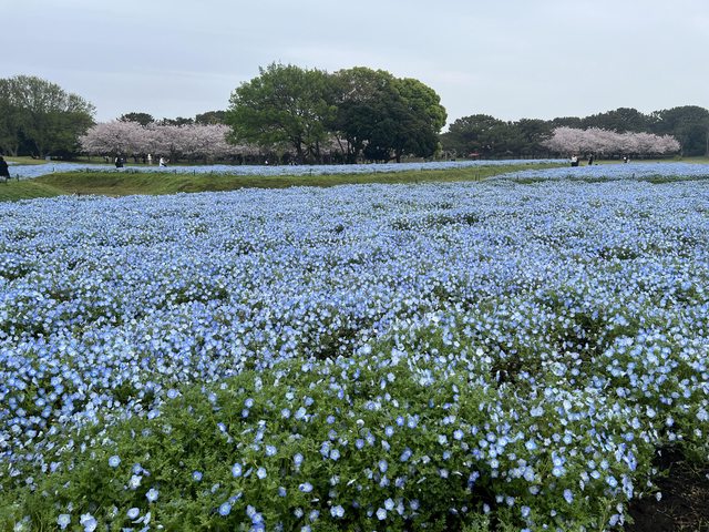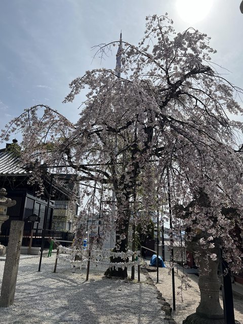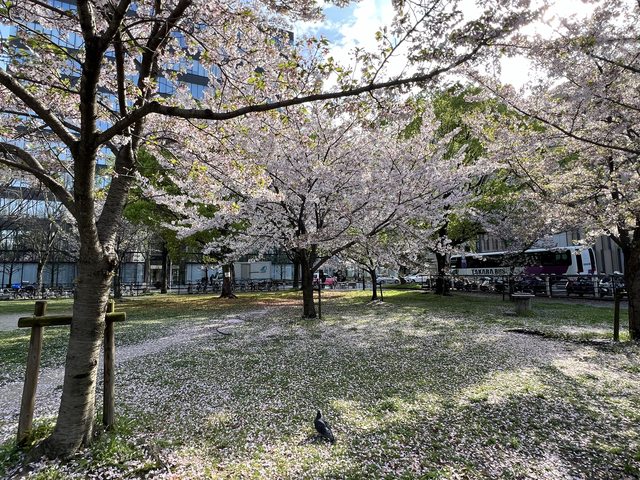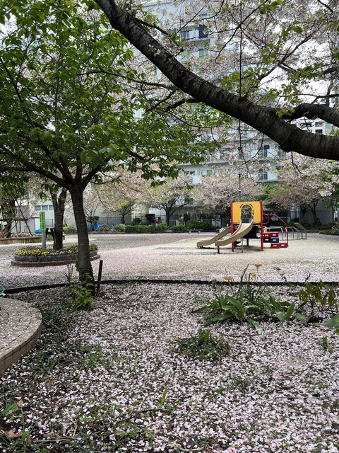 櫻花被昨天的大雨打落在地上讓地板變成粉紅色、配上後面的藍天超級美!