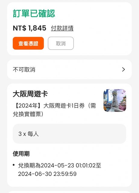 1. 讓售品項:Klook 購買的三張大阪周遊券(期限至2024/06/30)