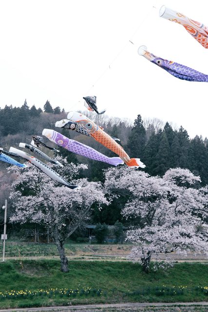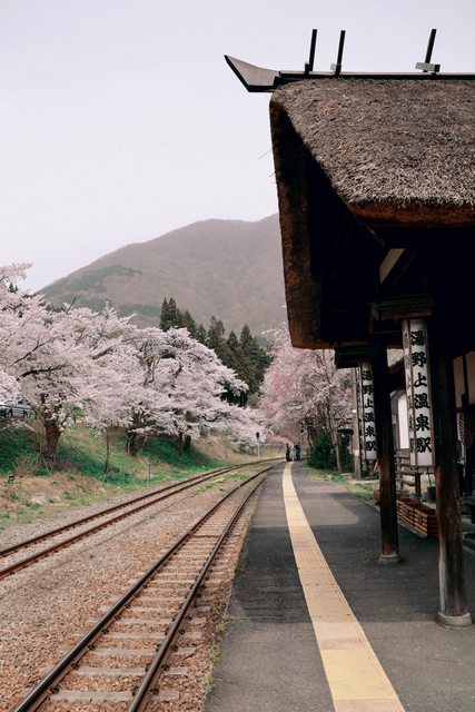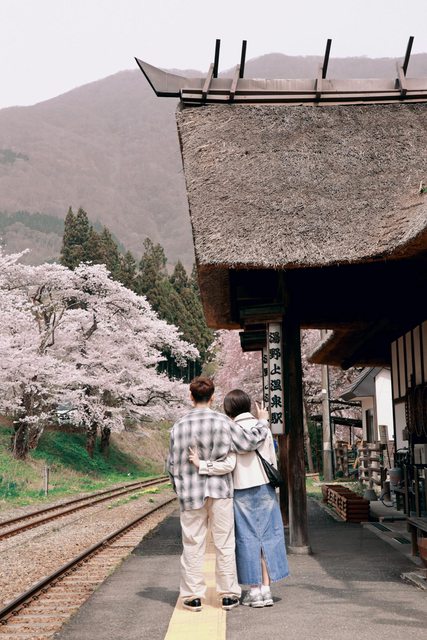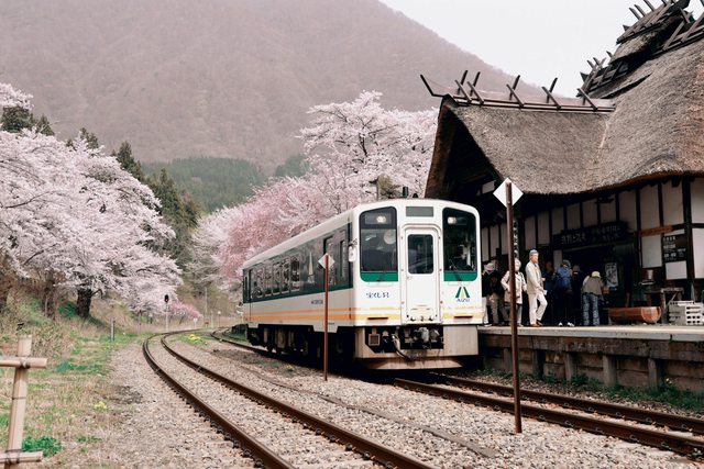 湯野上溫泉車站跟觀音寺川正滿開