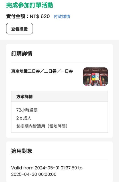 1. 讓售品項:東京72小時地鐵乘車券4張(因尚未兌換成實體票券,需2張為一單位)