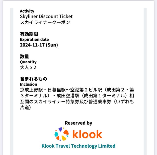 讓售品項:skyliner 成田空港到京成上野來回2張 不拆售