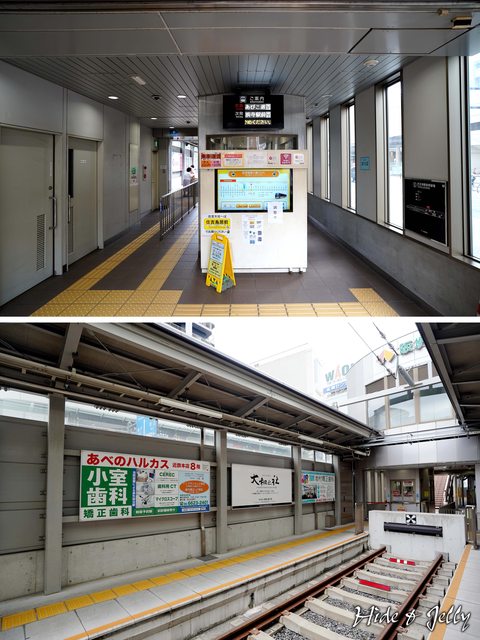 天王寺駅是阪堺電軌的起點,編號HN01的車站,由於車站位於馬路中央,必須從天橋走下