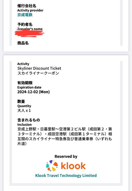 標題[讓售] Klook Skyliner 京成電鐵單程票*2
