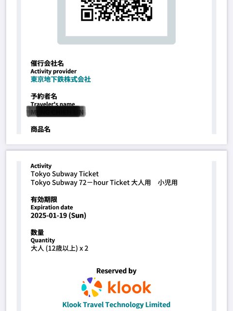 東京地鐵72小時券 兩張 ( 使用期限2025-01-19 )