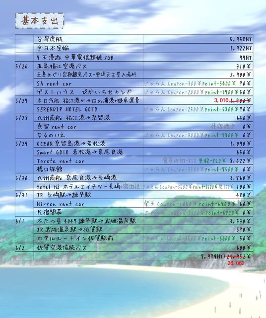 五島5天4夜以外的租車住宿扣除後大概是2萬5千台幣,給大家參考。