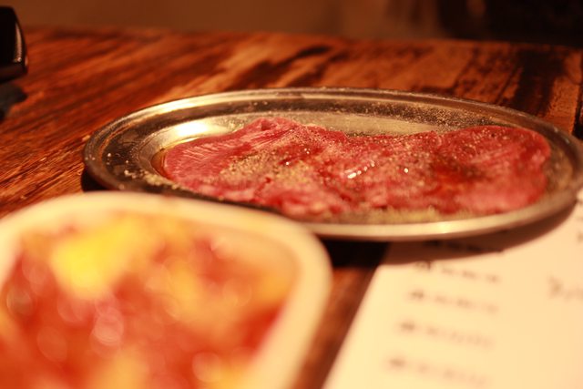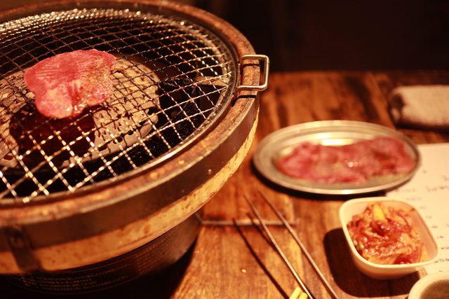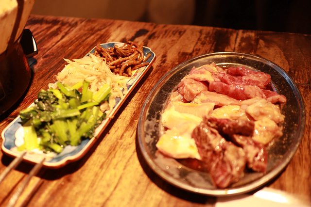 總共點了兩杯酒/五種綜合的肉/小菜和泡菜/牛舌/小碗白飯