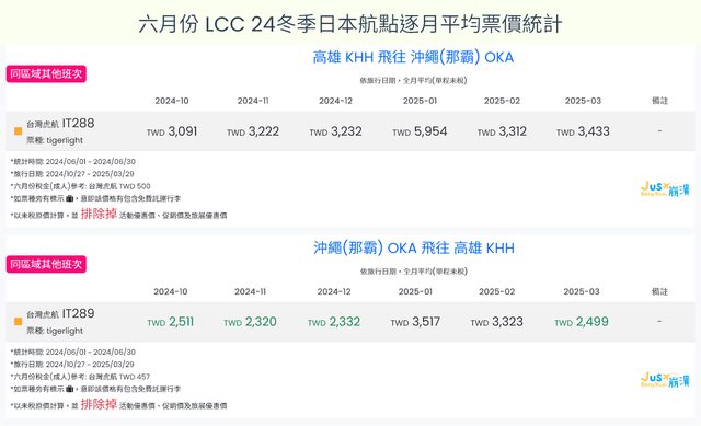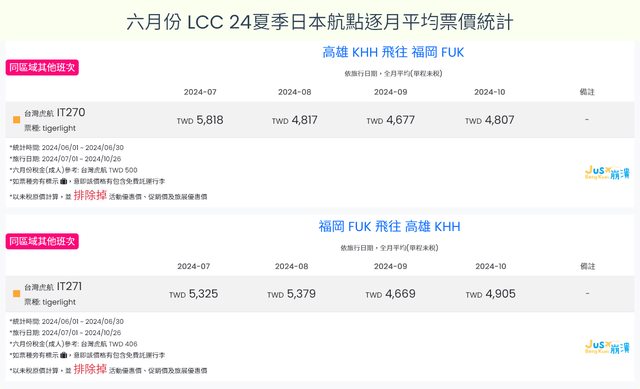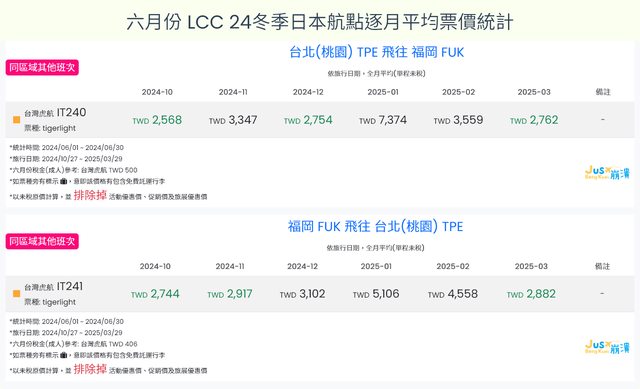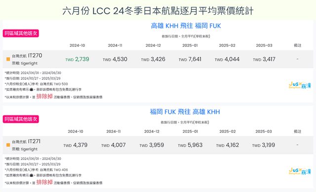 1. 台灣虎航 高雄福岡在10月只有飛 10/29 這一天,所以10月均價這欄指的是 10/29