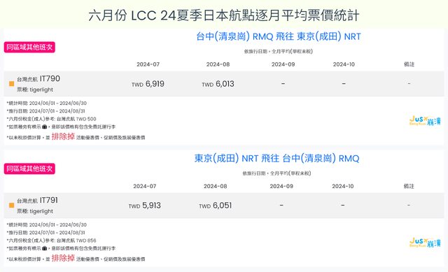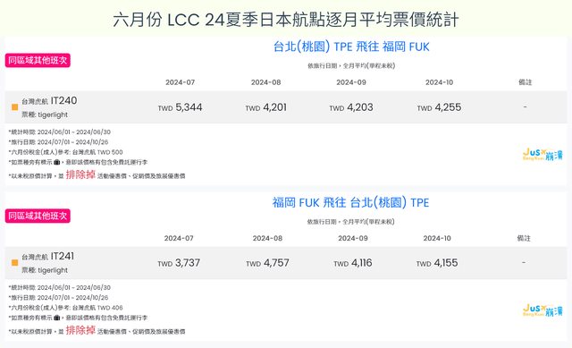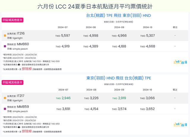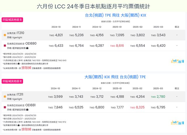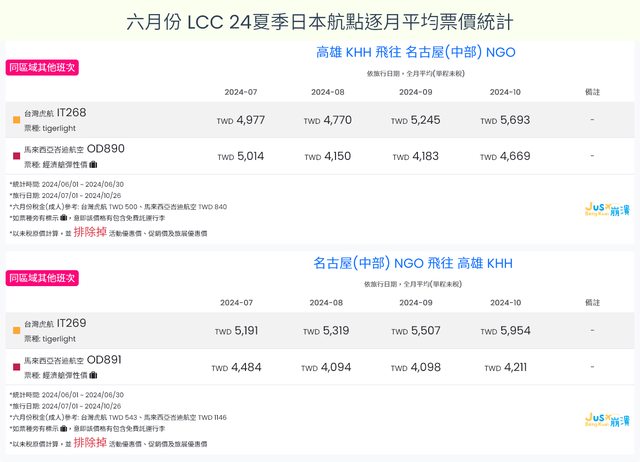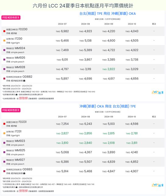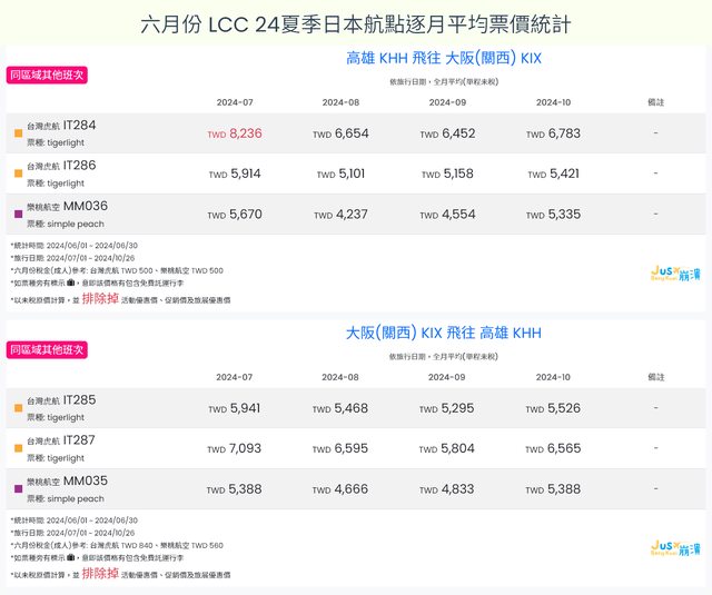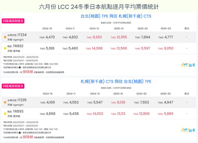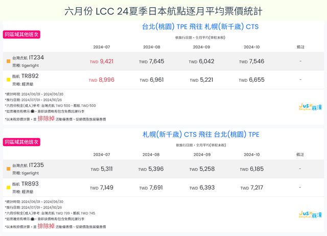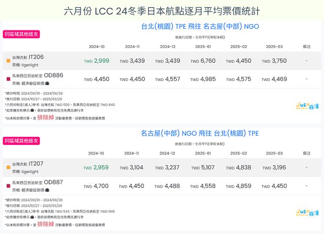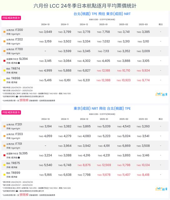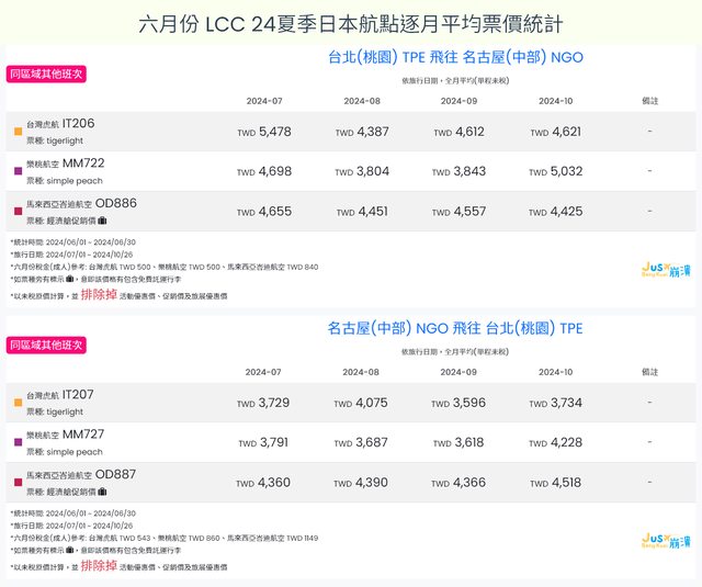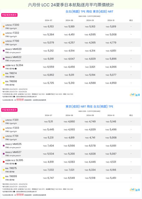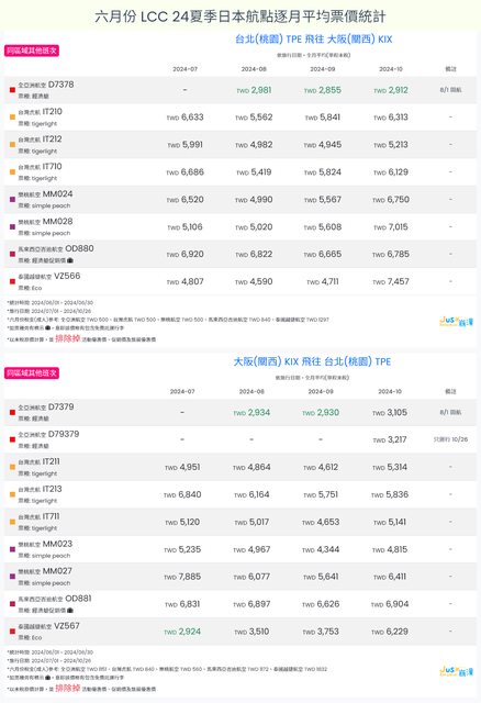 標題[分享] 6月LCC 24夏、24冬日本航點逐月均價統計