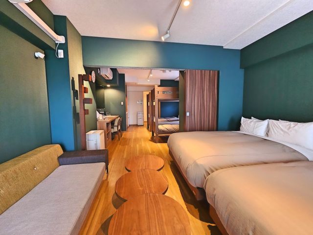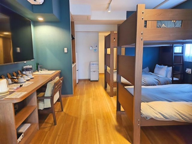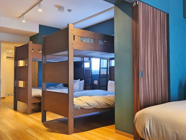 房間有兩張雙人床和兩張上下舖的床,