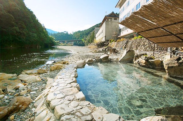 擁有自己的河岸溫泉,房間也配有溫泉風呂,位於奧熊野的「山水館 川湯みどりや」(下