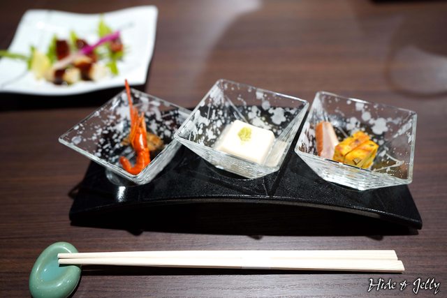一坐定後,先上來的前菜三小缽,由右至左依序是菜凍、豆腐、溪蝦,都蠻美味的。