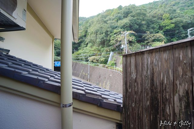 從陽台的風呂處探頭可以到前方的馬路與山坡上的小徑,不過如果不探頭,泡在浴桶內的