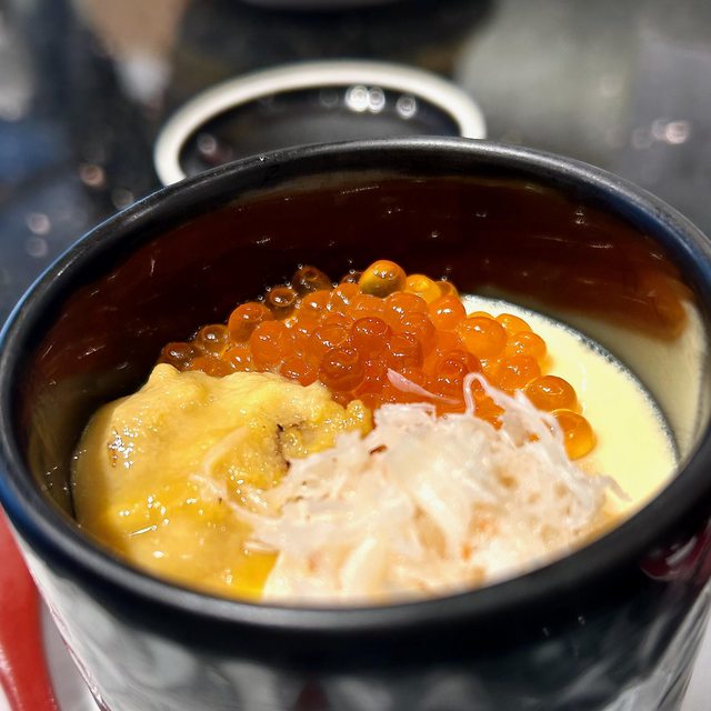 茶碗蒸上有蟹肉、海膽、鮭魚卵,除了蟹肉以外另外兩個配料都無感,蒸蛋本體好吃,內