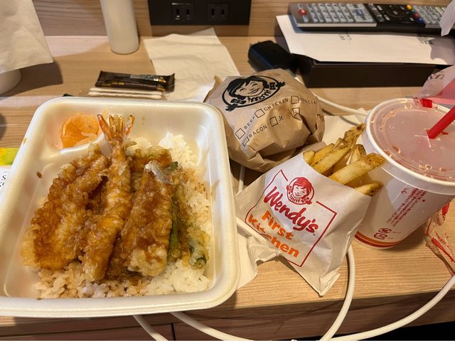 逛完後就搭單軌電車回飯店,在車站外買了天丼及溫蒂漢堡當晚餐。吃飽後在房間浴缸泡